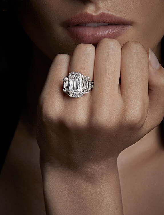 The patented 62-facet cut of the ASHOKA® Diamond is unique, being an elongated cushion cut with an ideal width to depth ratio, making the ASHOKA® Diamond appear up to 30 percent larger when compared to a generic emerald-cut diamond of the same weight.